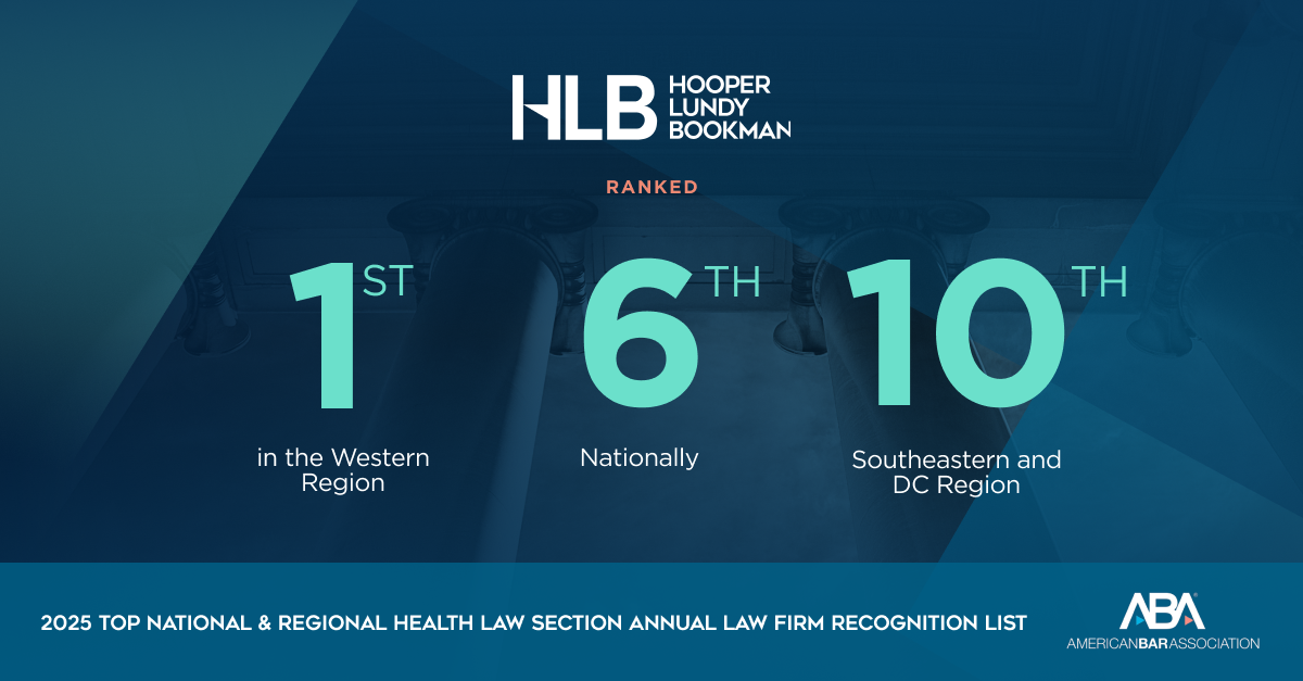 The American Bar Association (ABA) announced its 2025 Top National & Regional Health Law Section Annual Law Firms recognition. HLB ranked 1st place in the Western Region, 6th place Nationally, and 10th place in the Southeastern and Washington D.C. region.